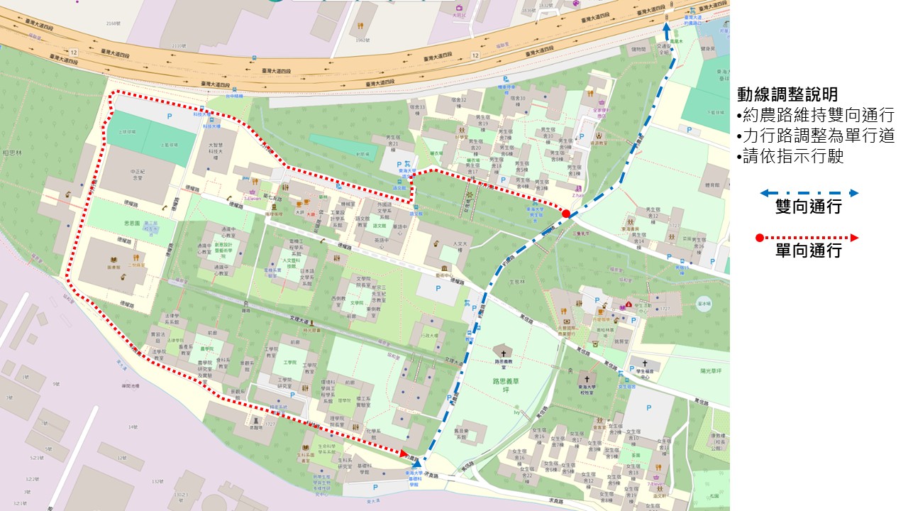 因應學生接駁需求及校園交通安全,第一教學區部分路段將調整為單向通行,並調整接駁站點,相關內容如下。
