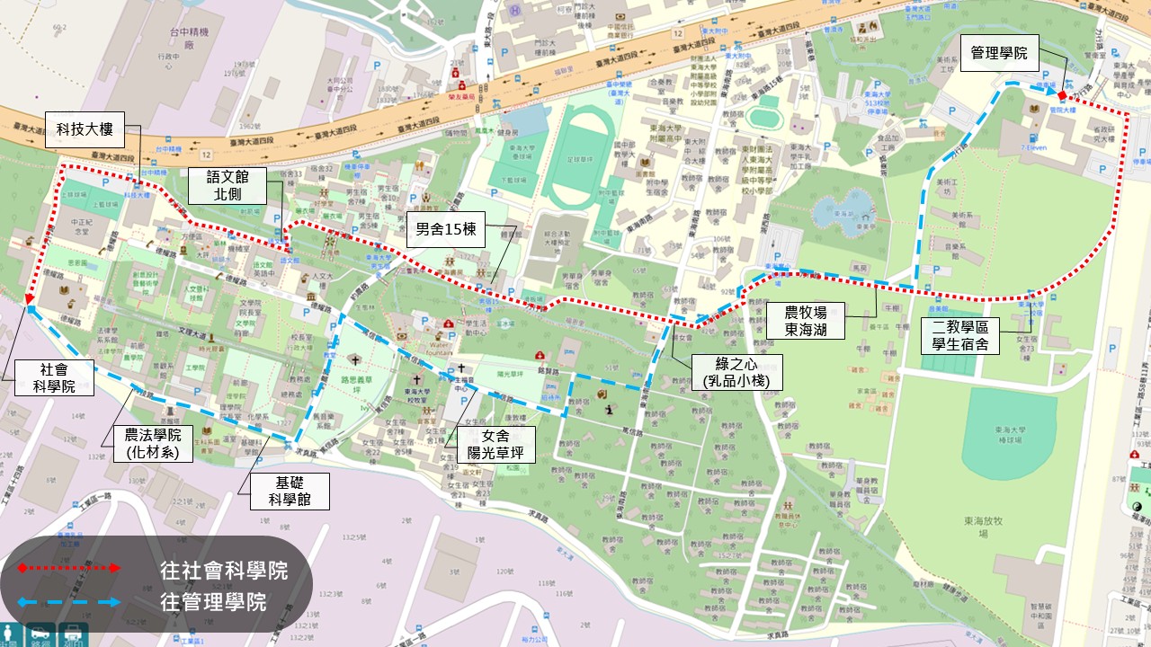 二、行駛區間為 社會科學院 ↔ 管理學院,分上行與下行,停靠站點如下:
