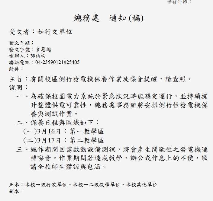 主旨:有關校區例行發電機保養作業及噪音提醒,請查照。